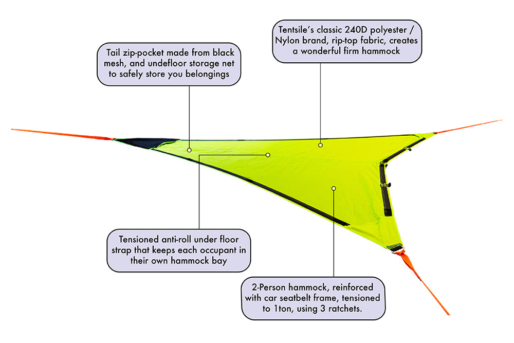 The DUO is simple to pitch (anyone can do it) and incredibly comfy, making it perfect for couples who may want more space, or young families. The hammock also features a huge tail pocket, underfloor storage and Tentsile's patented built-in lay flat anti-roll strap system, to create two separate sleeping bays so occupants can lay back in comfort without rolling into the middle.