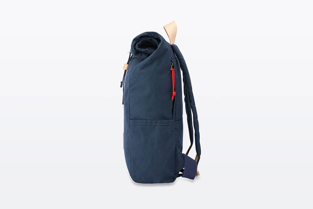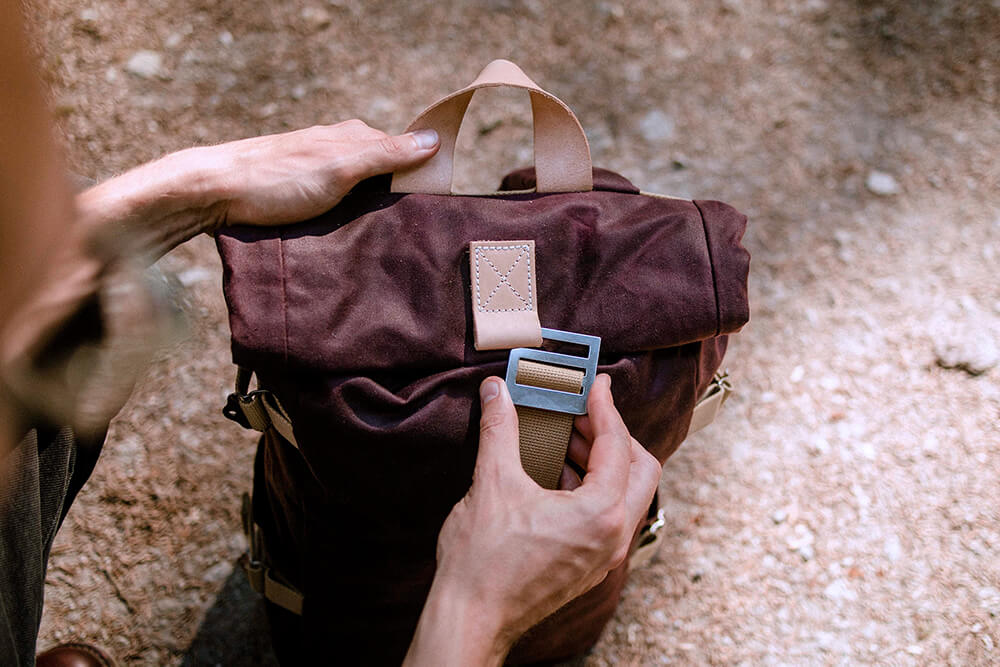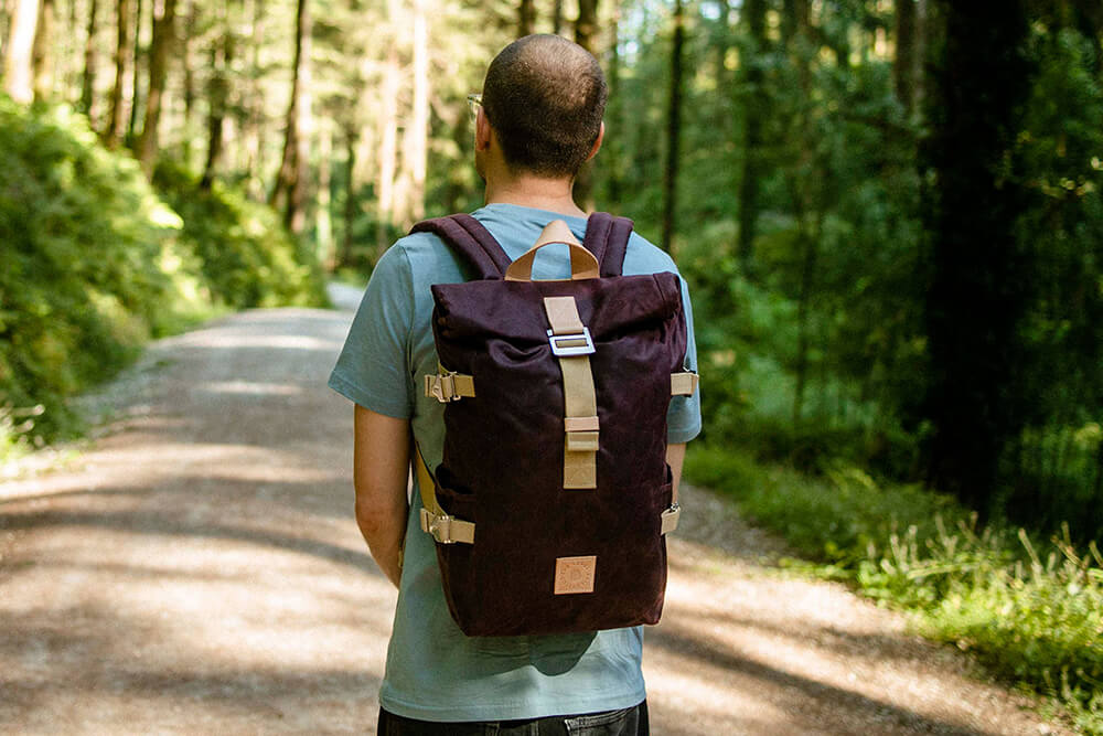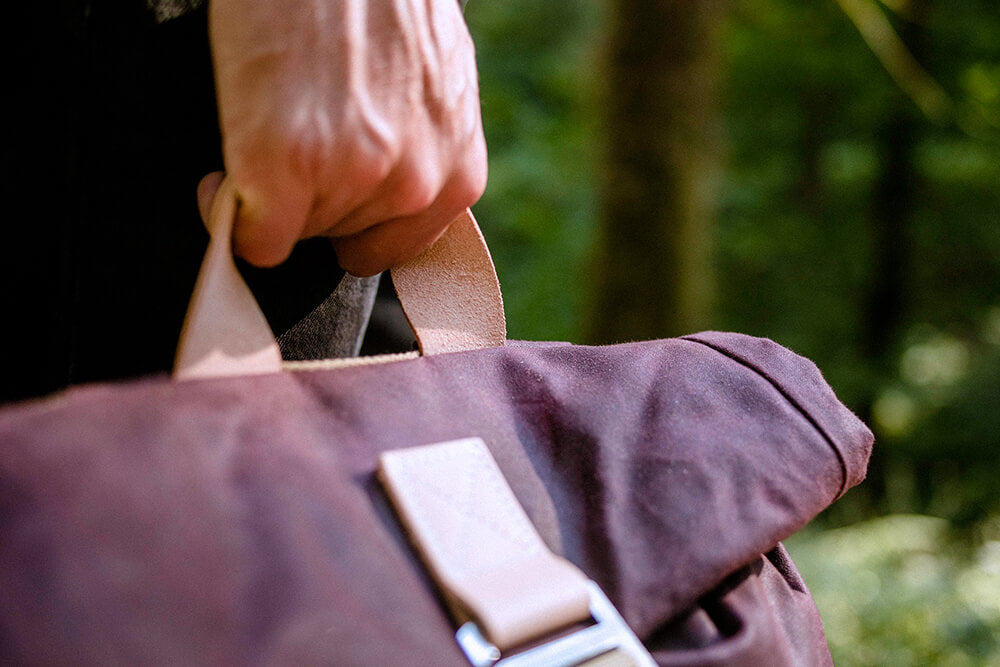 Zaino arrotolabile in cotone biologico cerato resistente alle intemperie, pensato per le giornate in città e i weekend all'aria aperta. Realizzato a mano in Gran Bretagna con materiali resistenti e sostenibili.