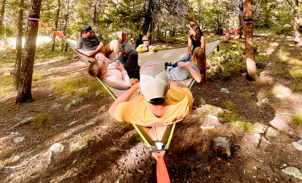 Three separate bays mean everyone gets a safe space without rolling into the middle or towards the heaviest person. The patented tensioned strap system reinforces the base whilst balancing weight differences, creating a firm surface with just enough flex to cushion and wrap around bodies without sagging. Unlike traditional hammocks, you’re free to lounge whichever way feels best for you- front, back, sides, or all of the above!