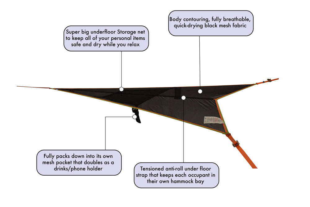 The T-Mini is super lightweight 2 person hammock with plenty of room for to to lie side by side in perfect comfort. An affordable, double camping hammock that offers everything you need for two people. It includes Tentsile's anti-roll technology, built in pockets and underfloor storage net - everything you need in a couple's hammock.